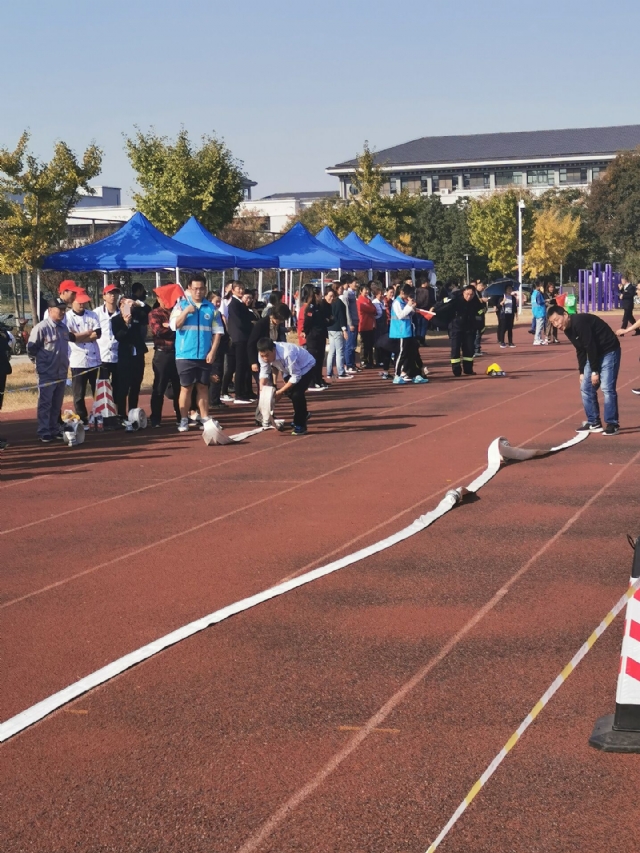 运动会分为四个部分,分别为“规范报警”“正确着装”“铺设水带”“消防灭火”。每个部分分别有相应的裁判计分,参赛院部派四名队员分别完成相应部分,按照四个人最后完成者的时间为截止,作为该队完成总时间,完成时间最短者获胜。每组队员比赛时都兴致高昂,大家相互鼓舞,团结协作,争取能在最短的时间内完成最规范的动作。