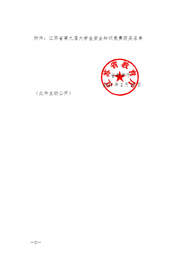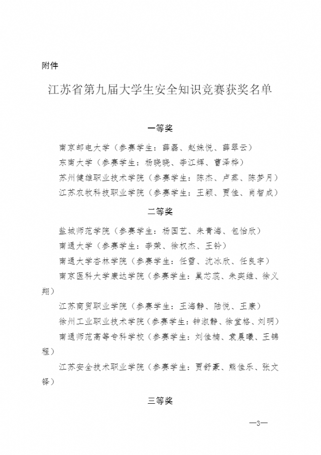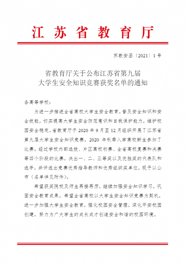 苏教安函〔2021〕1 号-省教育厅关于公布江苏省第九届大学生安全知识竞赛获奖名单的通知
