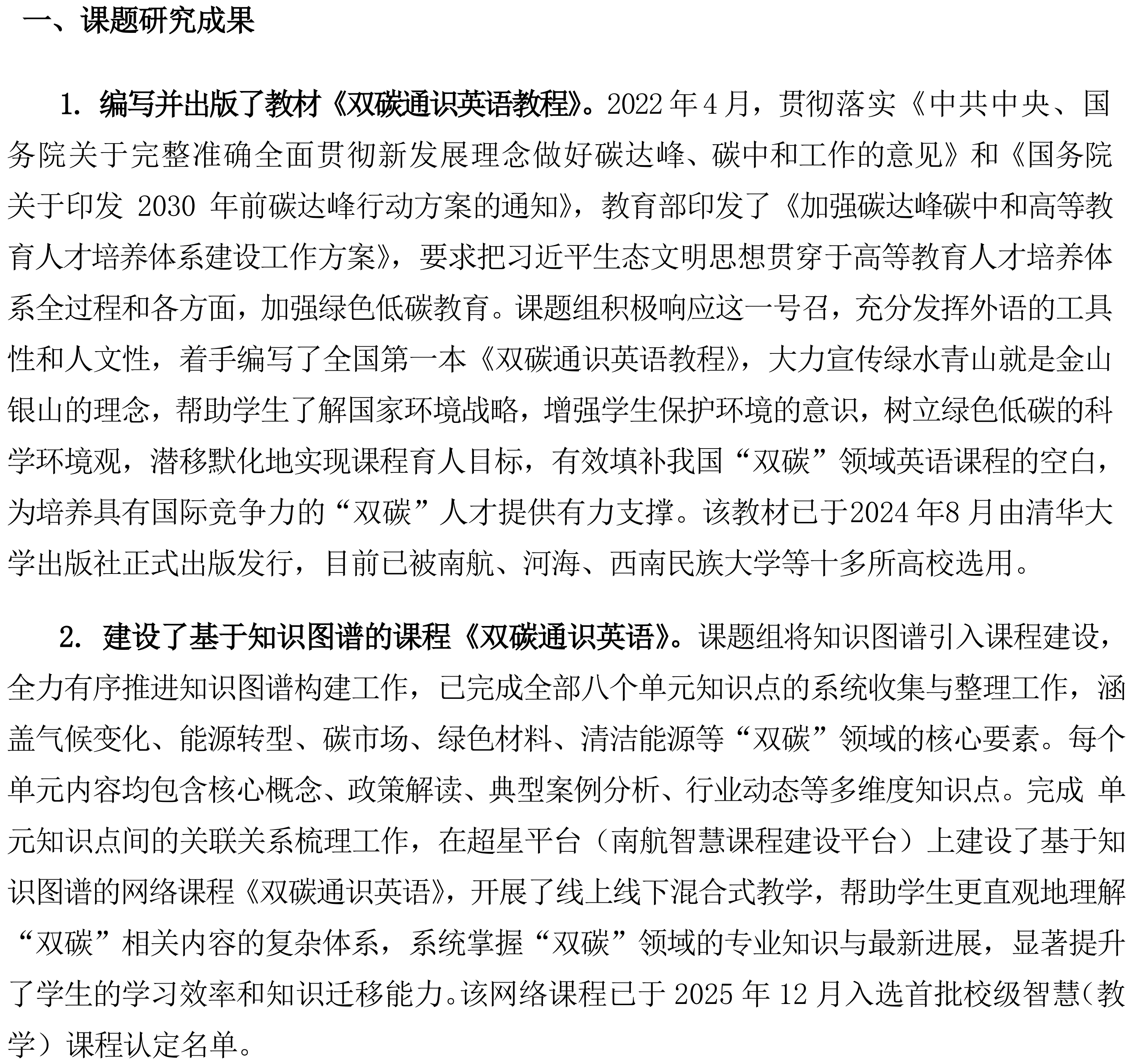 南京航空航天大学贾军、刘长江主持完成了2022年江苏省高校“高质量公共课教学改革研究”专项课题“基于“双碳”人才培养的“双碳英语”通识课程教材一体化开发与建设”(课题编号:2022JDKT073),课题组主要成员:吴婧、程义新、许阳